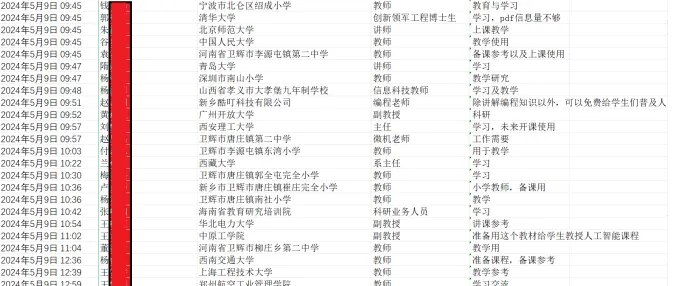 《人工智能通识课讲义》第一版于2024年5月8日发布,其中PDF版本完全公开,PPT版本对教育工作者免费开放。《讲义》发布后引起热烈反响。截至7月30日,共有662位教师及教育工作者申请PPT版本,他们来自585个不同单位,其中包括187所大学,143所学院及专科学校,197所中小学。除了国内的学校,我们还收到了来自日本、美国、新加坡等国外教研机构的申请。此外,也有来自中国电网、中国电信、中国石油、中国专利局等单位的讲义申请,用于内部培训。申请理由中排名前三位的是“教学”、“参考”、“学习”。