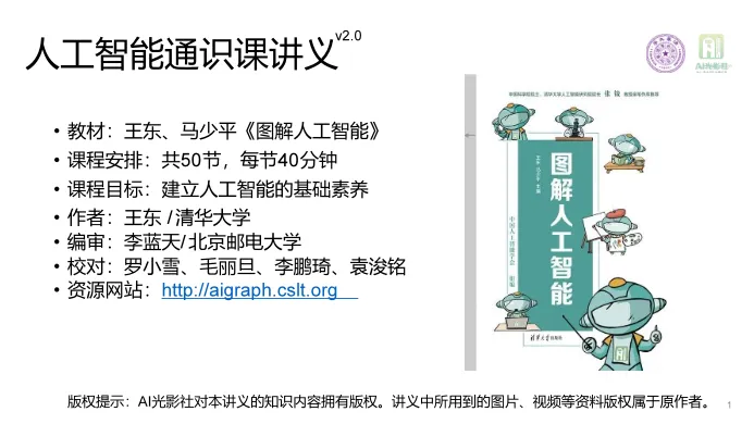 为满足大学本、专科院校人工智能通识教育的需求,AI光影社专家、清华大学王东老师以《图解人工智能》一书为教材,设计了50节《人工智能通识课讲义》,该《讲义》即日起升级为2.0版。在课堂教学中应用本讲义的教师请务必升级!