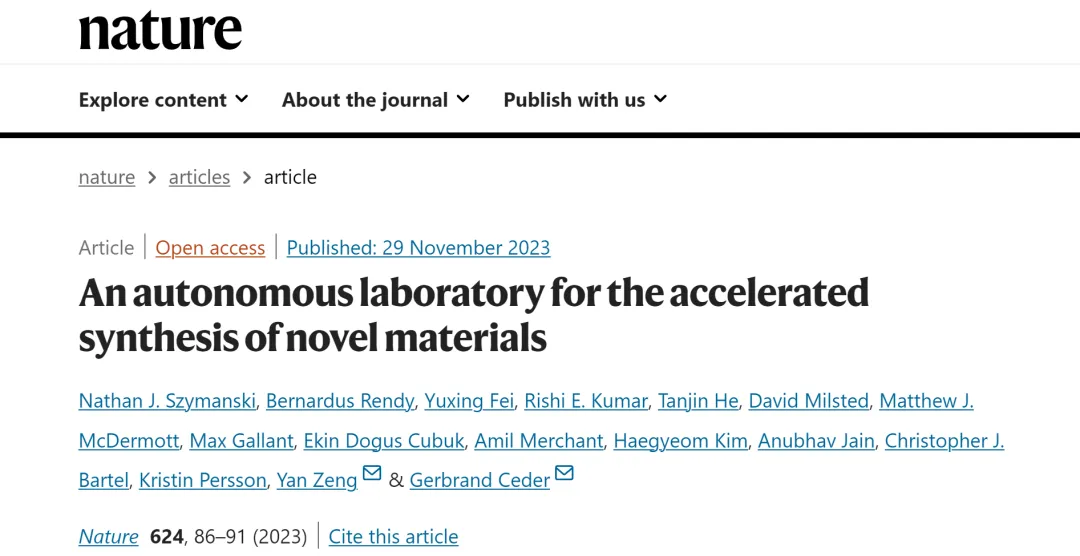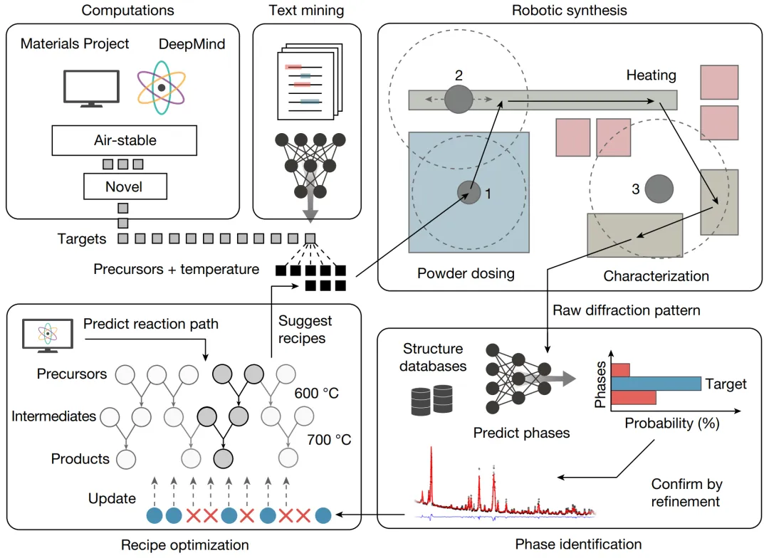 [1] Szymanski, N.J., Rendy, B., Fei, Y. et al. An autonomous laboratory for the accelerated synthesis of novel materials. Nature 624, 86–91 (2023).