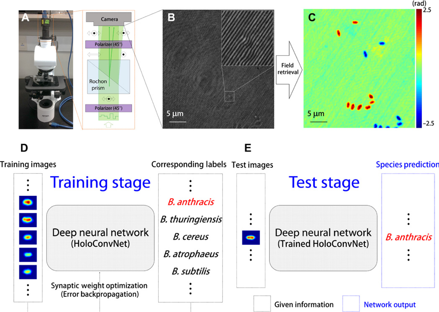 图4:结合全息显微图像和深度神经网络的炭疽芽孢杆菌预测。A: 全息显微镜设置;B:全息显微镜下的干涉图;C: 芽孢的相位图;D:深度神经网络训练;E:细菌种类预测。