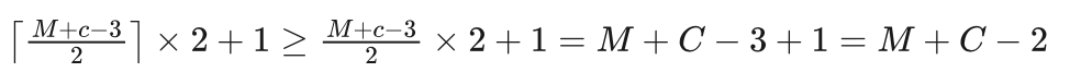 先考虑船在左岸的情况。如果不考虑限制条件,也就是说,船一次可以将三人从左岸运到右岸,然后再有一个人将船送回来。这样,船一个来回可以将2人运过河,而船仍然在左岸。而最后剩下的三个人,则可以一次将他们全部从左岸运到右岸。所以,在不考虑限制条件的情况下,至少需要摆渡 [(M+c-3)/2]*2+1 次。其中分子上的“-3”表示剩下三人留待最后一次运过去。除以“2”是因为一个来回可以运过去2人,需要 (M+c-3)/2 个来回把除了最后三人外的其他所有人运送过去,而“来回”数不能是小数,需要向上取整,这个用 [] 符号表示。而乘以“2”是因为一个来回相当于两次摆渡,总代价要乘以2。而最后的“+1”,则表示将剩下的3人运过去,需要一次摆渡。可以说, [(M+c-3)/2]*2+1 是在宽松条件下,把所有的传教士和野人全部从左岸摆渡到右岸所需要的最小摆渡次数。