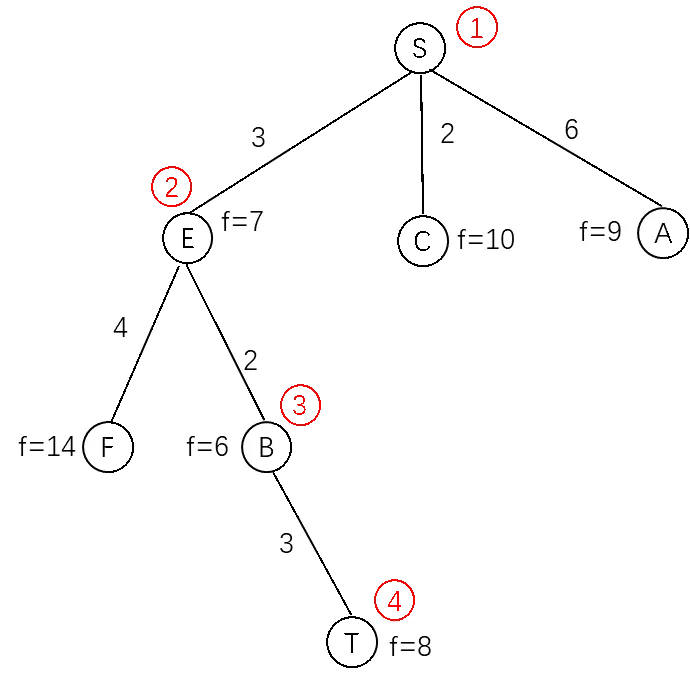 此时待扩展节点为A、C、F、T四个节点,其中f值最小的是节点T,同时T也是目标节点,所以算法结束,得到路径S-E-B-T。