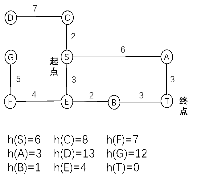 就反应了从初始节点S经过节点n到达目标节点T的路径距离,也就是这条路径的代价。比如在前面的例子中,由于C和F都是远离目标状态的,它们的h值就会比较大,从而导致f值比较大,就有可能避免对这两个节点的扩展,从而提高了算法的效率。