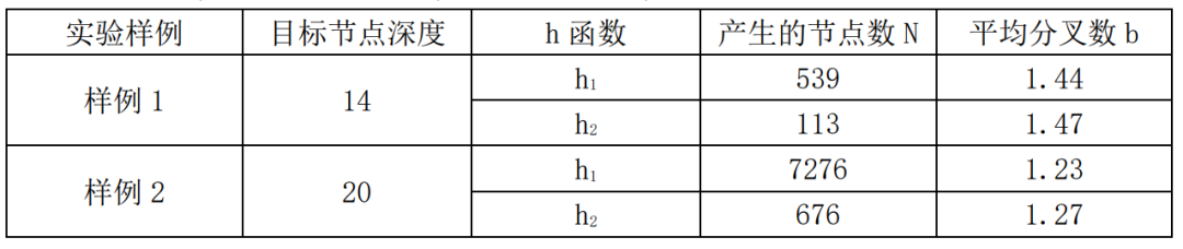 我们随机生成2个八数码问题的初始状态,最佳解路径的长度分别为14和20,分别采用两个不同的h函数用A*算法求解,并计算不同情况下的平均分叉数b。结果如下表所示。