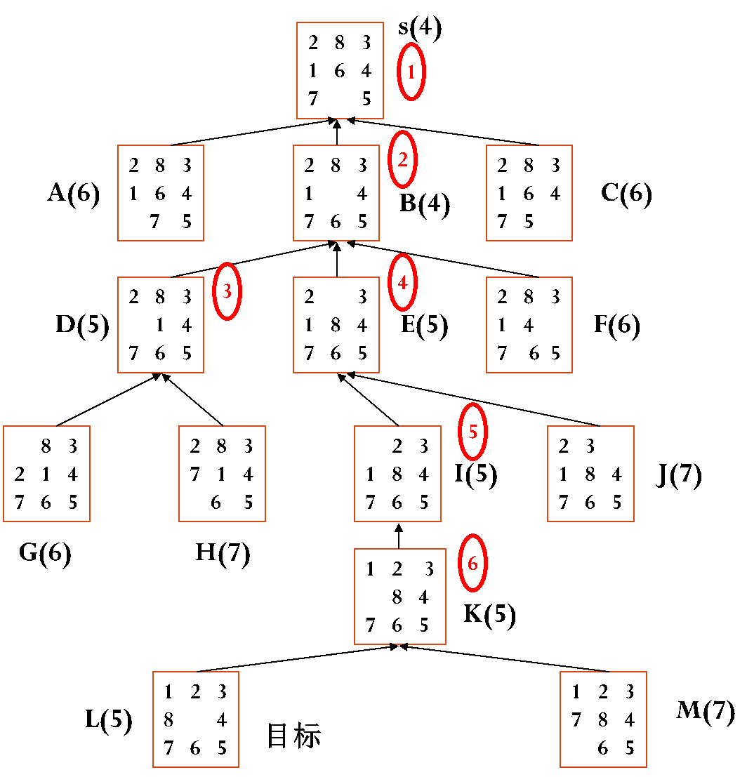 图3.16给出了采用A算法求解该八数码问题的搜索图。图中红圈中的数字表示节点被扩展的次序,英文字母旁括号中的数字表示计算出的该节点的f值。