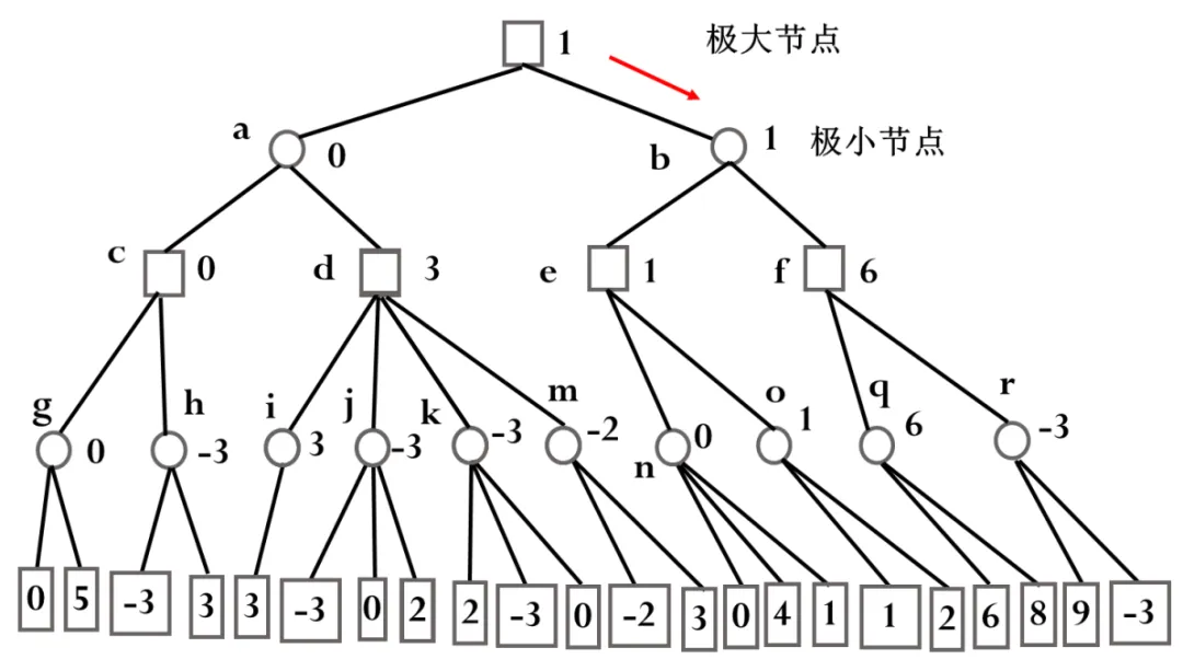 假设局面是否有利可以用一个分值表示,大于0的分值表示对甲方有利,而小于0的分值表示对乙方有利,等于0则表示双方势均力敌,是一个双方都可以接受的局面。我们从倒数第二行的圆圈开始考虑,这一行应该轮到乙方行棋。比如对于节点g,乙方可以有两个选择,一个可以得到分值0,一个可以得到分值5。由于分值越小对乙方越有利,所以乙方肯定会选择走获得0分值的那一步,而不会选择走获得5分值的那一步。对于节点h也同样,乙方肯定会选择获得-3分值的那一步。这一行的其他节点也一样,都是从其子节点中选择获得分值最小的那步棋。所以我们可以总结为,对于这一层来说,乙方总是选择具有极小值的节点作为自己的走步。图中倒数第二行节点边标的数字就是乙方所获得的分值。