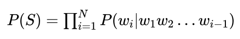其中 P(wi|w1w2...wi-1) 表示当句子中前i-1个汉字为 w1w2...wi-1 时,第i个汉字为 wi 的概率,符号“ ”表示“连乘”,也就是每个汉字出现在句子中的概率连乘在一起就是句子的概率。