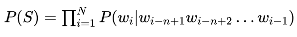 当句子比较长时,这样的语言模型参数会非常多,为了减少模型的参数,一般会假定句子中一个汉字的出现只与其前面n-1个汉字有关,称作n元语言模型。这样句子概率的计算可以修改为: