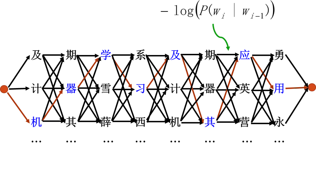 如果句子中两个汉字之间的代价表示为 -log(P(wi|wi-1)),则拼音输入法问题实际上就是求由给定拼音串中拼音对应的所有候选汉字组成的篱笆型有向图的最短路径问题,每个句子的路径长度由上式给出,通过Viterbi算法就可以得到该问题的最优解,从而得到给定拼音串最对应的汉语句子,也就是概率最大的句子。