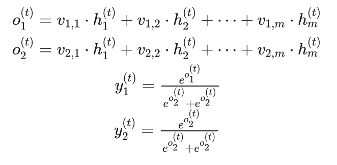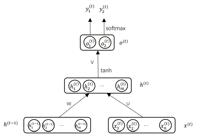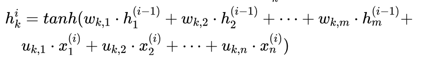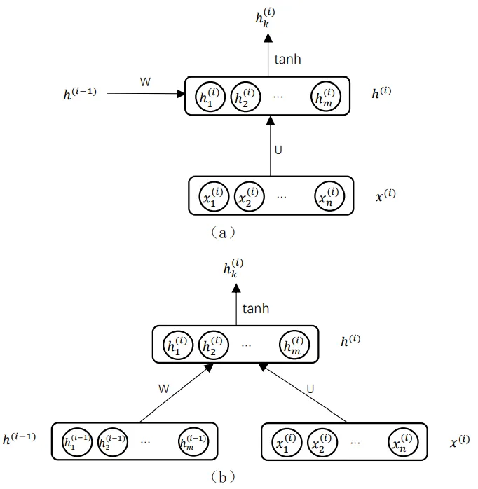 两组,这两组输入连接在一起可以看成一组输入,输出层每个神经元对应 h^(i) 的一个分量,h^(i-1) 和x^(i) 的每个分量到输出层的每个神经元都有连接,如果 h^(i-1) 的第j个分量到输出层第k个神经元的权重为 Wk,j ,x^(i) 的第 个分量到输出层第k个神经元的权重为Uk,l ,则施以tanh激活函数后,输出层第k个神经元的输出