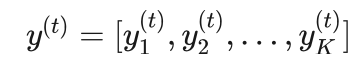 图1.57给出了一个用循环神经网络实现的看图说话系统示意图。图中 x^(t) 为图像的向量表示,就像刚才说过的一样,该图像要输入到循环神经网络的每个子网络中。输出是与图像内容相关的一句话,对应这句话的第t个词,其中K为词表长度,
