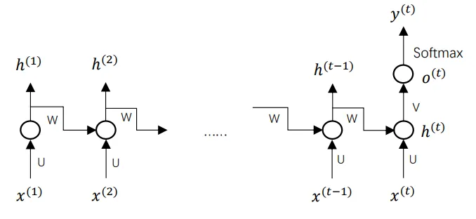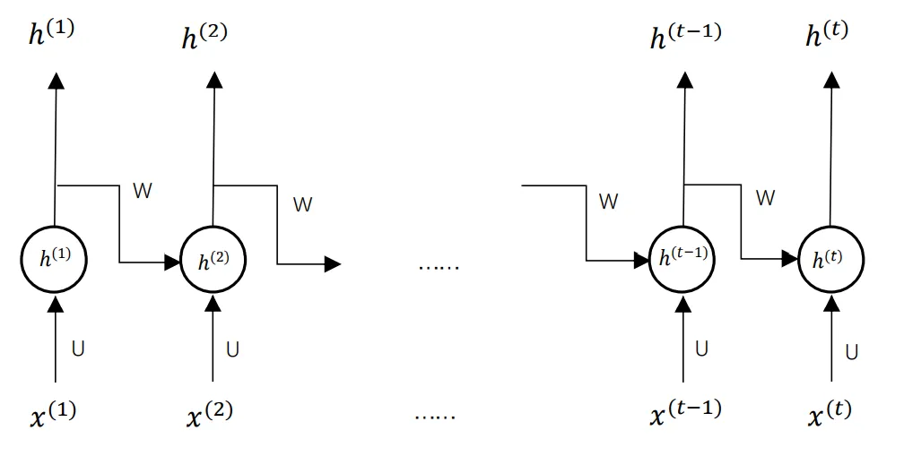 循环神经网络主要用于处理序列输入,在序列处理结束时,获得输入序列的向量表示。如果输入的是一个句子,则相当于是词序列,句子处理接受后就可以得到该句子的向量表示。循环神经网络共用一个处理单元,以当前输入(输入序列中的当前处理元素)和此输入之前的序列向量为输入,得到到目前为止的序列向量。
