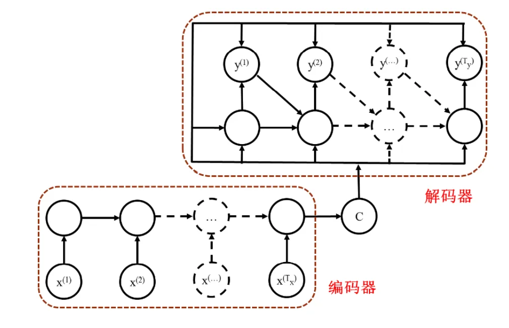 艾博士:在前面我们介绍的句子情感分类例子中,循环神经网络将一个句子表达为一个向量,然后再分类。而在看图说话例子中,输入是一个向量,通过循环神经网络将向量又表达为一个序列。其实我们也可以把这两种循环神经网络连接在一起,先将一句话表达为一个向量,再通过一个循环神经网络将该向量表达为一个序列。如图1.59所示。其中将一个句子表达为向量我们常称为编码,而将一个向量又表达为一个序列称为解码。这种循环神经网络我们称为序列到序列循环神经网络。