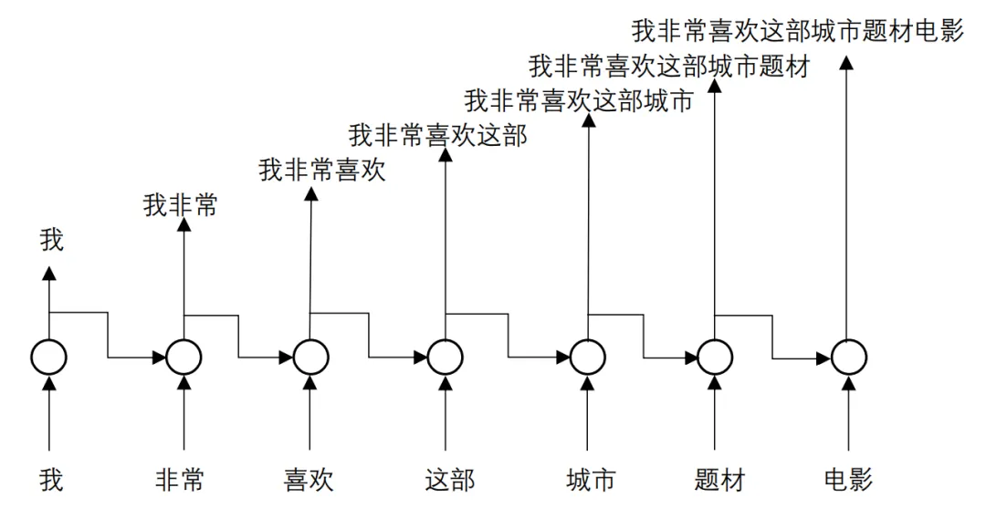 比如前面我们举例的这个句子:“我非常喜欢这部城市题材电影”。第一个词只有一个“我”,这时我们知道这句话可能是要表达“我如何”;当第二个词“非常”出现后,就了解到这句话可能是想表达“我非常如何”,可能是喜欢,也可能是讨厌等。随着第三个词“喜欢”的出现,我们就知道可能是想表达“我非常喜欢”某种东西或者某件事情……,以此类推,直到句子结束,我们就知道了这句话表达的是什么内容。这个过程用图示的形式表达出来如图1.48所示,图中每个圆圈接受当前词和之前所有词的语义信息作为输入,而圆圈的输出就是到当前这个词时,包括当前词在内的前面几个词合在一起的语义信息,最后一个圆圈的输出则表达了整个句子的语义信息。