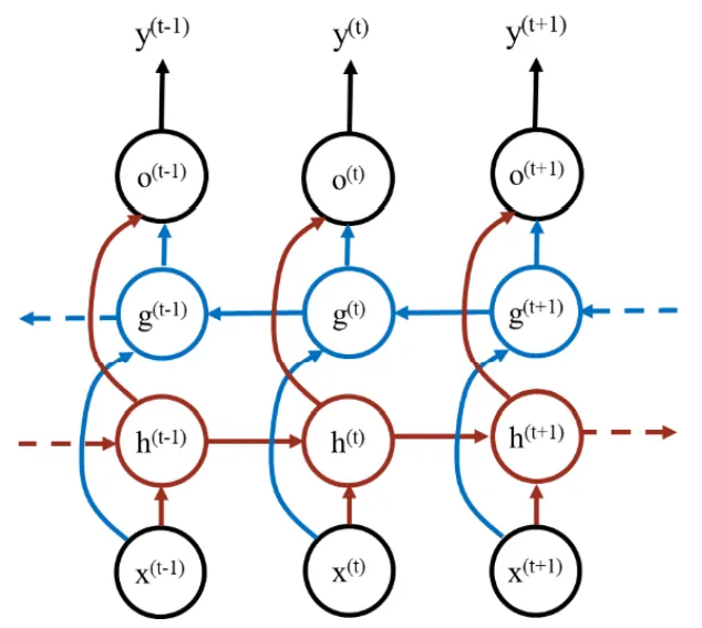艾博士:为此研究者提出了双向循环神经网络,如图1.58所示。其基本思路就是对于一个输入序列,正向处理一次,反向处理一次,然后将两次处理的结果拼接在一起用于后续处理。比如“我 喜欢 看 电影”这句话,正向处理就是“我 喜欢 看 电影”,反向处理就是“电影 看 喜欢 我”,这样对于这句话的第i个词我们可以从正向得到一个向量表示 h^(i) ,也可以从反向得到一个向量表示g^(i) ,然后将 h^(i) 和 g^(i) 连接成一个向量使用,其他就与普通循环神经网络一样了。由于正向、反向各计算了一次,从而削弱了一句话中前面内容被后面内容淹没的问题。