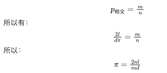 艾博士接着讲到:另一方面,如果我们投掷了n次针,其中有m次针是与底线相交的,那么针与底线相交的概率就是: