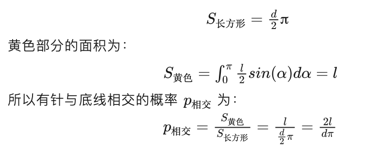一旦确定了α和x之后,针的位置就确定了。如图2.10所示,绿色长方形内任何一点(α,x)就确定了一次投针的位置,按照针与底线相交的条件,黄色区域代表针与底线相交,绿色长方形内的白色区域,代表针没有与底线相交。所以黄色区域的面积除以绿色长方形的面积,就是针与底线相交的概率p( 相交 )。