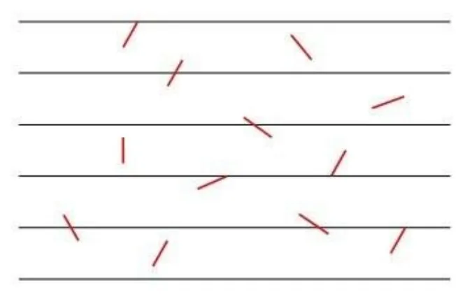 艾博士:如图2.8所示,假设有一张放在桌子上带格子的稿纸,随机向纸上扔一根针,那么针与格子之间会呈现出不同的状态,有时候针会与格子相交,有时候针会落在两条线之间。