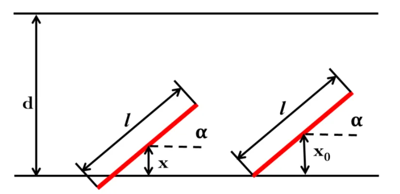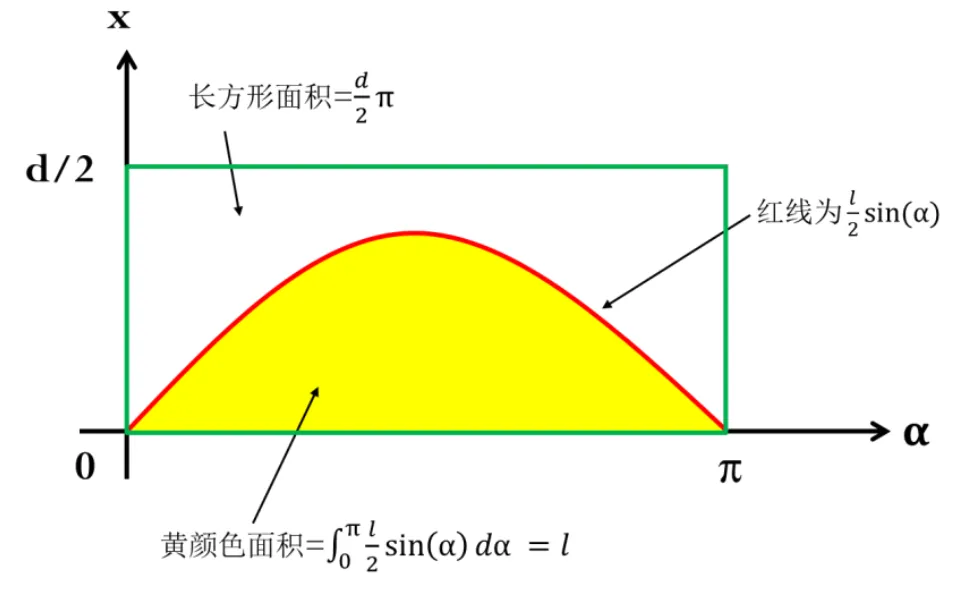 夹角α的可能变化范围应该是[0,2π],对于针来说如果我们不区分针头和针尾的话,夹角α处于[0,π]和[π,2π]是一样的,所以为了简化起见,我们只考虑[0,π]这一变化区间。同理对于针的中间位置是处于格子的上半段还是下半段也是一样的,因为如果处于下半段就看是否与底线相交,如果处于上半段就看是否与顶线相交,所以我们也只考虑是否与底线相交这种情况。这样的话,x的取值范围是[0,d/2],α的取值范围是[0,π]。