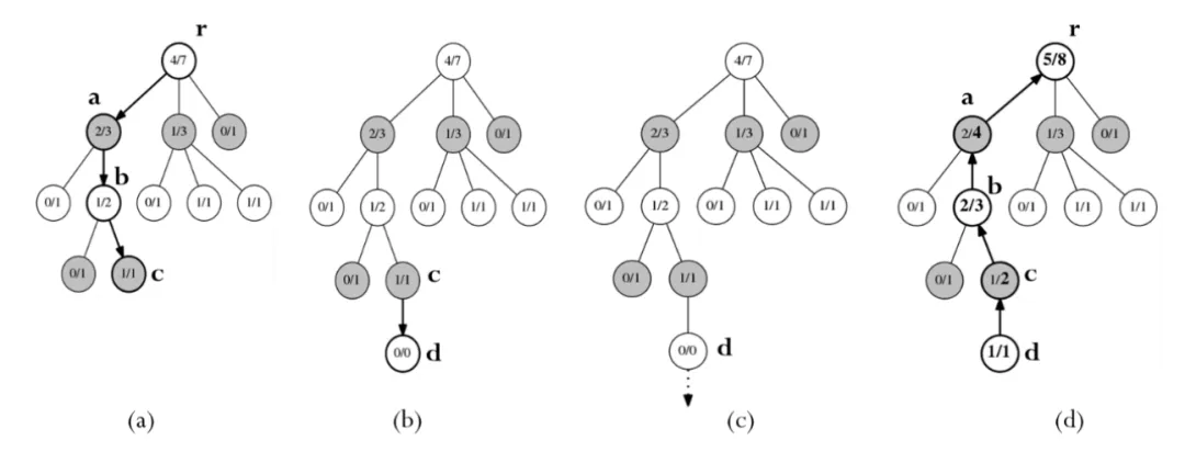 图2.13(a)是当前的搜索树,从节点r开始进行选择,节点r的三个子节点中,a的信心上限值最大为2/3 ,所以选择节点a。假定a没有其他未生成的子节点了,所以继续从a的两个子节点中选择,节点b的信心上限值最大为 1/2 ,同样假定b也没有其他未生成的子节点了,继续从b的两个子节点中进行选择,节点c的信心上限值最大为 1/1 ,而且由于c存在未生成的子节点,所以选择过程结束,节点c被选中。