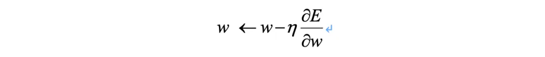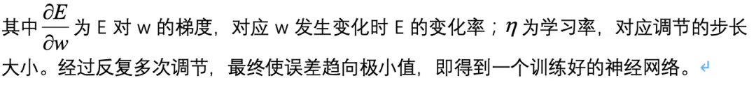 那么,究竟要如何对权重进行调节呢?这涉及到一个梯度的概念。我们定义网络的输出和理想目标之间差异为E,这一差异是所有网络权重w的函数,其取值因w的变化而变化。数学上,定义E对w的变化率为梯度。可以证明,当w发生变化时,在梯度方向E的取值提高最明显。因为我们的目标是使E下降,那么最佳的调节方向就是E对w的负梯度方向,这类似于发现水温过高,要反向调节热水阀门。按负梯度方向调节权重,使得输出与目标误差更小,这一方法称为梯度下降法。写成权重更新公式如下: