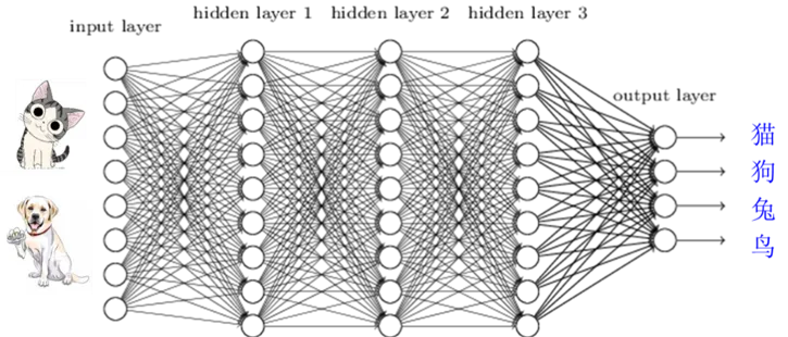 我们以图1所示的全连接神经网络来说明BP算法的工作原理,其中最左边是输入层,最右边是输出层,中间部分为隐含层。图中每一条边对应一个权重,基于这一权重,后一层节点计算前一层节点输出的加权和,经过一个激活函数后形成本层输出。如果权重选择的足够合理,则可以建立一个由输入到输出的映射,基于此实现某种人工智能任务。图1所示的是一个识别猫、狗、兔和鸟4种动物的宠物识别系统,输入是宠物的图象,每个输出节点代表一种宠物。当输入某一宠物的图片时,该宠物对应的输出节点将产生比其它节点更强的激发值,从而实现宠物识别。