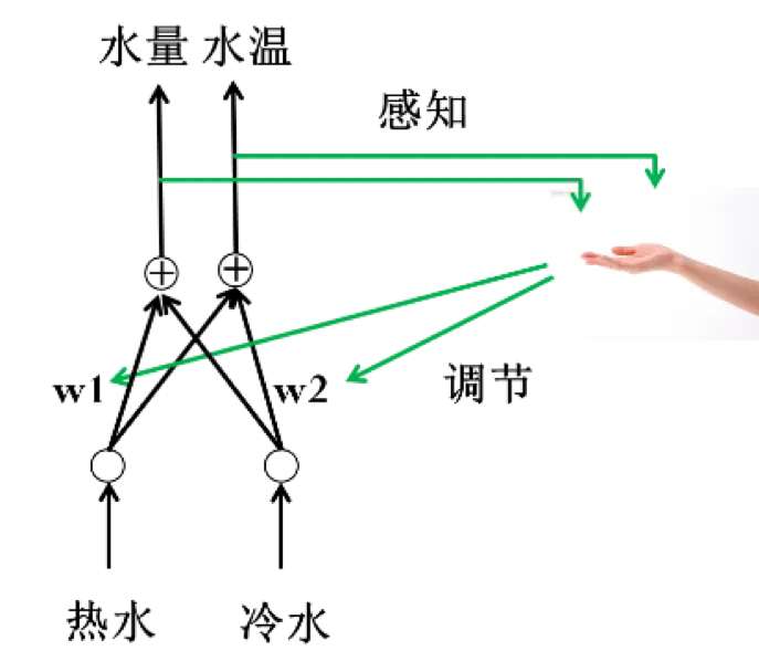 当我们想洗澡时,需要调节到一个合适的温度和合适的水量,这是我们的期望目标,而冷热水的阀门可以认为是权重。通过调节阀门的大小,可以让输出的水温和水量逐渐接近我们的目标。