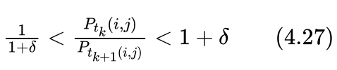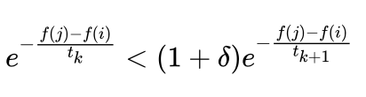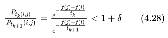 艾博士:对于状态i和j,如果温度从 tk下降到 tk+1的话,当温度下降幅度很小时,则在温度 tk 下从状态i到状态j的被接受概率 Ptk(i,j) 应该与在温度 下从状态i到状态j的被接受概率 差别不大,两个概率之比应该接近于1。所以有: