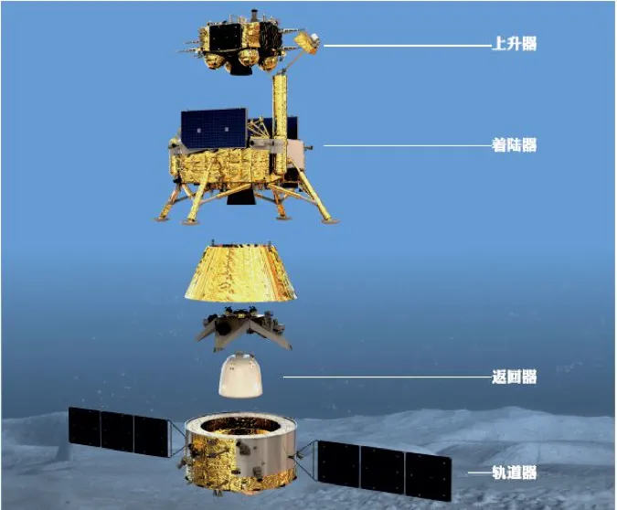 与前几位嫦娥相比,嫦娥五号的任务要复杂的多,她不仅要飞临月表,还要实地降落和采集月壤。科学家们设计了一个糖葫芦结构,把上升器、着陆器、轨道器和返回器四部分串起来。飞临月表时,放出上升器和着陆器在月表着陆,完成采集任务后再由上升器将月壤样品运送到飞船主体,飞返地球。