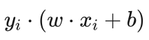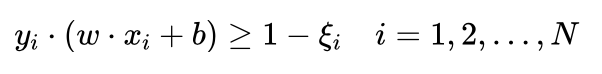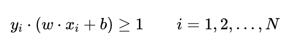 在该问题中,要求训练集中的所有样本到最优分界面的函数间隔均大于等于1,也就是满足条件: