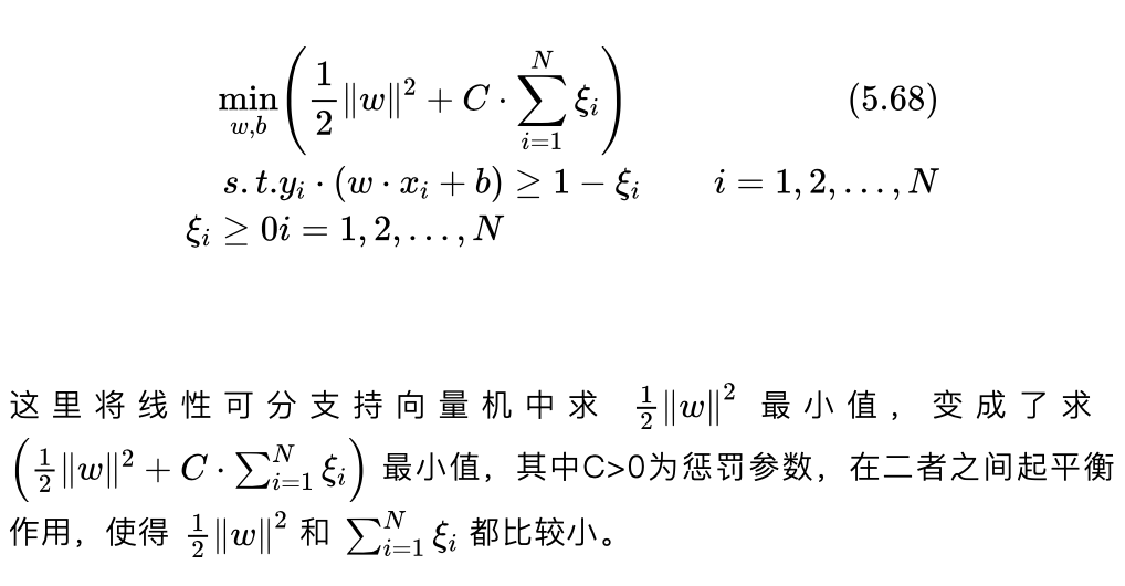 为此我们引入松弛变量 ξi>=0(i=1,2,...,N) ,每个样本 xi 对应一个 ξi=0 ,对于满足约束条件的样本 xi ,其对应的 ξi=0 。对于不满足约束条件的 xi ,我们允许该样本到超平面的函数间隔小于1,但是也不能太离谱,要求大于等于 1=ξi ,也就是式(5.67)中的约束条件修改为: