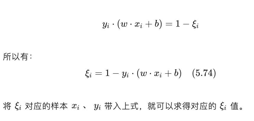 小于0的情况。当标记为负类的样本点被错分成正类时,也会出现同样的结果。也正是由于这一点,对于错分类的样本点,我们也可以通过式(5.74)计算错分类样本点 xi 对应的 ξi 值。