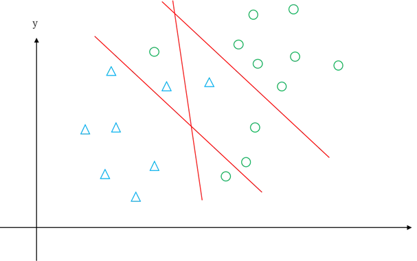 小明:您前面介绍的支持向量机叫线性可分支持向量机,也就是说要求训练集中的样本必须是线性可分的。如果训练集不满足线性可分条件,比如说绝大部分样本可以用一个超平面分开,但是有少数样本不能被区分开,如图5.33所示两类样本交叉在一起的情况,无论怎么画直线也不能将两类分开,这种情况下还可以使用支持向量机方法构造一个分类器吗?