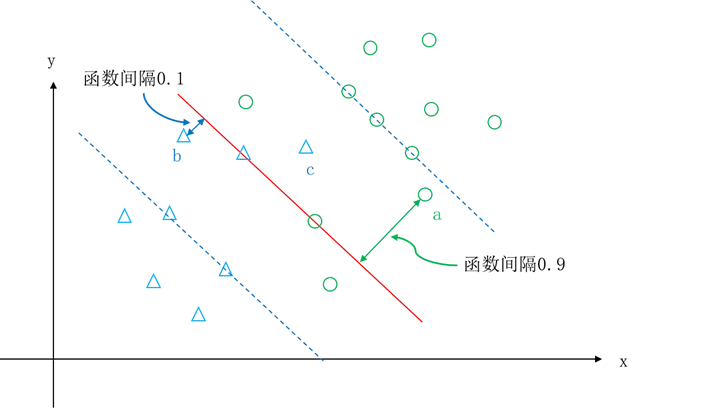 艾博士:当然这么做也不是不可以,但是不满足该条件也有程度上的不同。如图5.34所示,假设样本a到最优超平面的函数间隔为0.9,虽然不满足约束条件,但是也只是以微小差距不满足约束条件,样本b到最优超平面的函数间隔为0.1,显然二者不是等价的,如果在a与b中选择一个样本允许其不满足约束条件的话,我们会更愿意选择a而不是b。再看样本c,其不但不满足约束条件,还“跑”到了超平面的另一端,更是我们希望尽可能避免的。