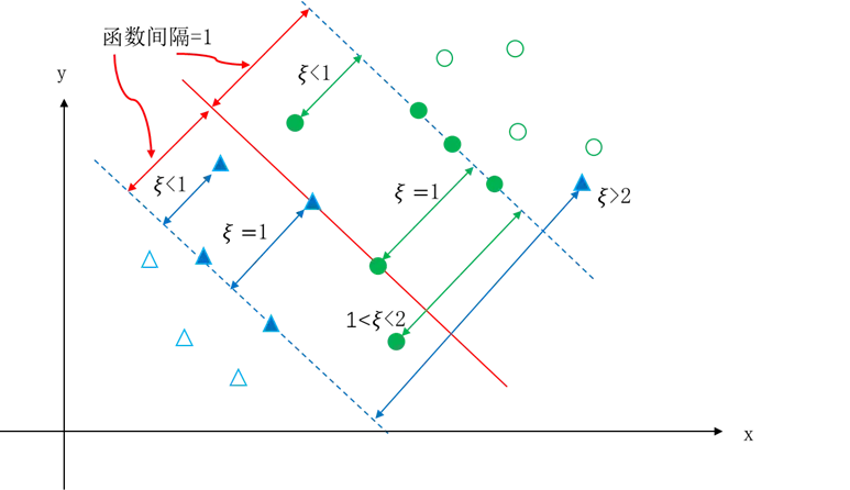 图中实心样本点均为支持向量,空心样本点均不是支持向量。处于虚线上的三个绿色样本点和两个蓝色样本点,是标准的支持向量,他们到最优超平面的函数间隔为1,对应的 ξi 值为0,对应的αi* 满足 0<αi*<c 。ξ<1 对应的样本点,其分类正确,相应的 αi*=c 。ξ>1 对应的样本点,其分类错误,相应的 αi* =C。