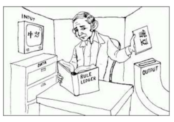 图灵测试的基本思路是,如果机器的行为方式和人没有差别,那就说明它拥有了智能。然而,美国哲学家约翰.希尔勒(John Searle)对这一智能定义提出了质疑,认为用图灵测试来定义智能是远远不够的,这种外在表现出来的智能并不能保证机器有了自己的思维。为此希尔勒给出了一个称为“中文屋子”的假想实验来阐明他的思想[1]。