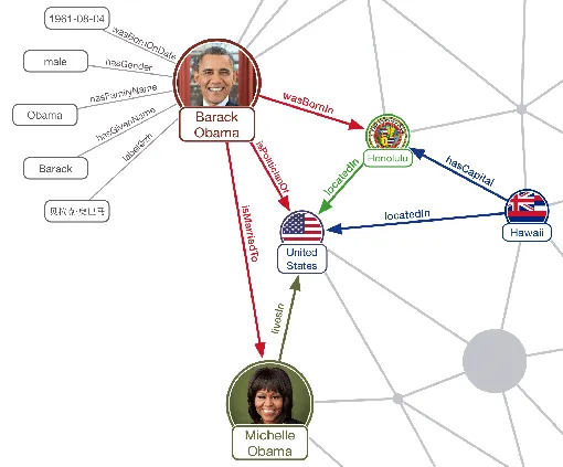 形式上,图谱中的知识可用每条边所代表的三元组来表示,如 “奥巴马->总统->美国”。然而,因为这些孤立的三元组连接成了网络,使得我们可以推导出更多衍生知识。例如,如果我们知道了美国总统是奥巴马,而美国首都是华盛顿,那么就可以很容易推导出“奥巴马的工作地点在华盛顿”。因此,知识图谱所代表知识远比直观看到的实体间的连接要丰富。