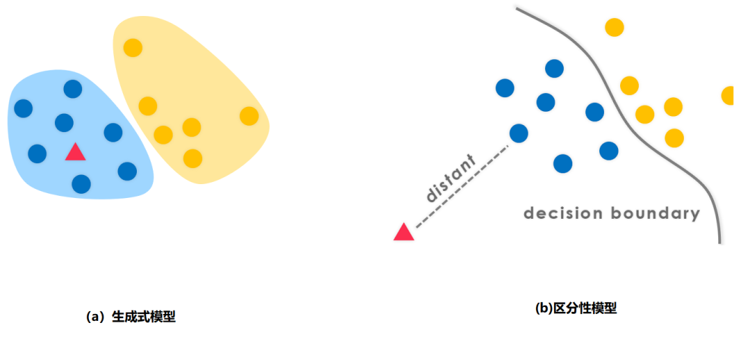 如图1(a)所示,生成式分类模型的基本思路是对每一类数据建立一个生成模型,用以描述该类数据的分布特性;对新来的测试样本(图中红色三角),哪一类数据对应的模型生成 该测试样本的概率最大,说明该样本和这一类数据更相似,因此应该被分到这一类中。常见的生成式分类模型包括高斯模型和高斯混合模型等。