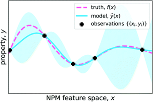 蓝色实线表示预测结果,蓝色阴影面积表示预测方差 (不确定性),黑色十字表示观察样本 (即已被验证的结构)。可以看到,越是没有被观察样本覆盖的区域,预测方差越大。