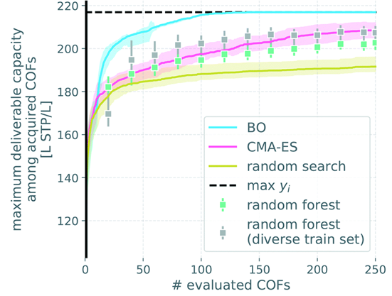 图6是一个实验结果,实验数据包含6.9万个共价有机框架 (COF) 结构。其中,横轴代表了已验证材料的个数,纵轴是所有已验证材料中的最大吸附值。黄色曲线 (random search) 是随机选择的结果,绿色和灰色的点代表非在线学习方法,红色曲线 (CMA-ES) 是用遗传算法的选择结果 (另一种在线学习方法,通过已验证过的最优材料生成下一次实验的候选),蓝色曲线 (BO) 是贝叶斯优化方法的结果。可以看到,贝叶斯优化方法通过少量实验 (100次) 即可得到最优结构 (黑色虚线),极大节省了实验成本,并且表现优于其他AI方法。
