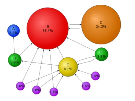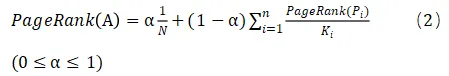 在PageRank算法中,一个网页的PageRank值反应了该网页被访问的概率,概率越大说明网页的重要性越大。假定网页P链接到了网页A,并且P链接到包括A在内的K个链接,PageRank(P)为访问到P的概率,再假定用户访问到P后,按照均匀分布访问P链接到的K个网页,则从P访问A的概率为PageRank(P)/K。如果有n个网页链接到了A,分别为Pi(i=1,2,…,n),而网页Pi分别链接到Ki个网页,则通过这些网页访问A的总概率为通过这些网页访问A的概率之和,即: