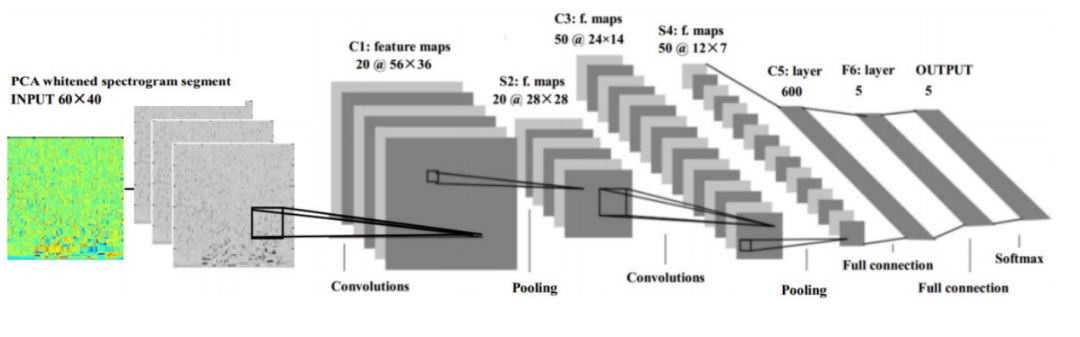 深度学习兴起后,基于深度神经网络的情感识别方法得到广泛应用。图3是一个基于卷积神经网络(CNN)的情感识别系统,输入为一段语音信号,经过若干卷积和池化操作后输出情感类别。实验结果表明,在一个包括10位发音人5种情感的数据库上,这一方法可得到40%的正确率。