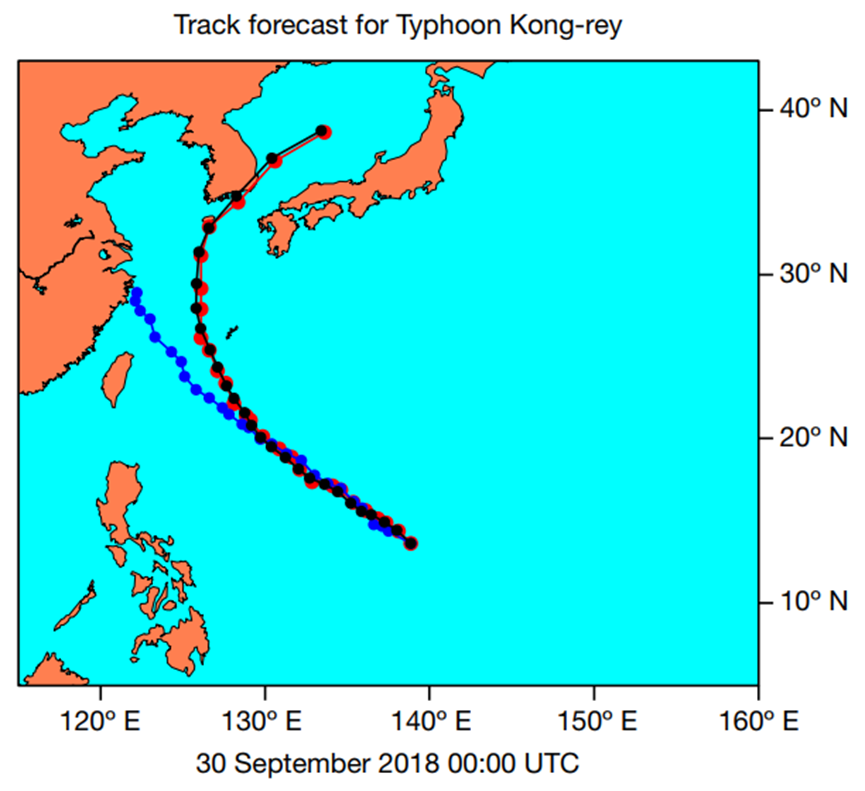 盘古AI天气预测系统预测台风康妮的轨迹。黑线是实际走向,红线是盘古预测走向,蓝线是欧洲中期天气预测中心的预测走向[4]