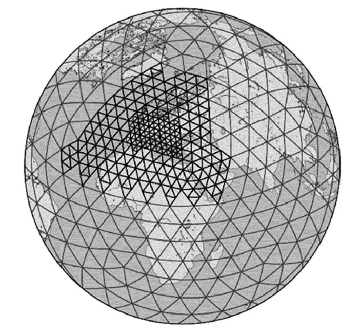 传统方法是这样的:首先将地球表面按经纬线划分成相同大小的格子(如下图所示);接着,根据流体动力学和热力学的原理,形成一组数学方程;然后,以当前的大气状态作为初始条件,比如气压、温度、密度、湿度和风速等,使用数值计算方法求解这一方程组,就可以预测未来某个时刻的天气了。