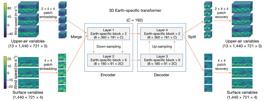 例如,《自然》杂志在2023年7月刊登了一篇华为公司的新研究[4]。在这项工作中,研究者们利用了全球39年的气象数据,训练了一个深度神经网络。这个网络的输入是当前地表和高空的一些观察数据,输出是这些数据未来一段时间的预测值。这些数据包括两部分变量:(1) 海平面上方13层不同气压处的观测值,每层观测值包括5个变量 (地重力势、湿度、温度和两个方向的风速);(2) 海平面处的4个观测量,包括2米处温度、10米处两个方向风速、海平面气压。这些变量的观测值经过分块、映射成嵌入向量,并组合在一起,送入一个3维Transformer结构进行编码和解码,最后恢复到数据空间,形成对未来的天气预测。