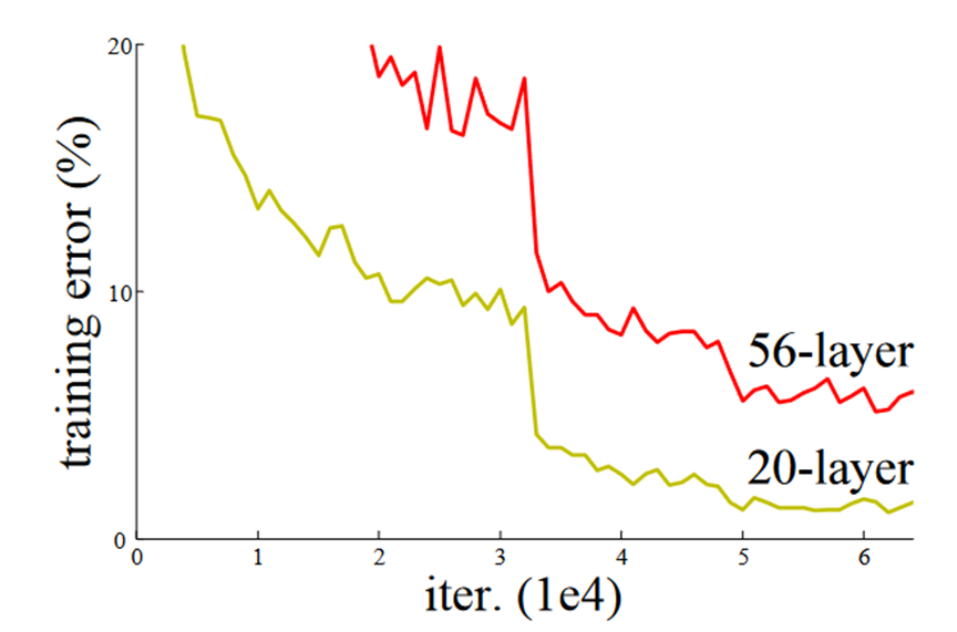 人们发现并不是。如图所示,训练两个网络,一个20层,一个56层,结果56层的训练误差比20层的还要大,意味着更深的模型反而学的更差。