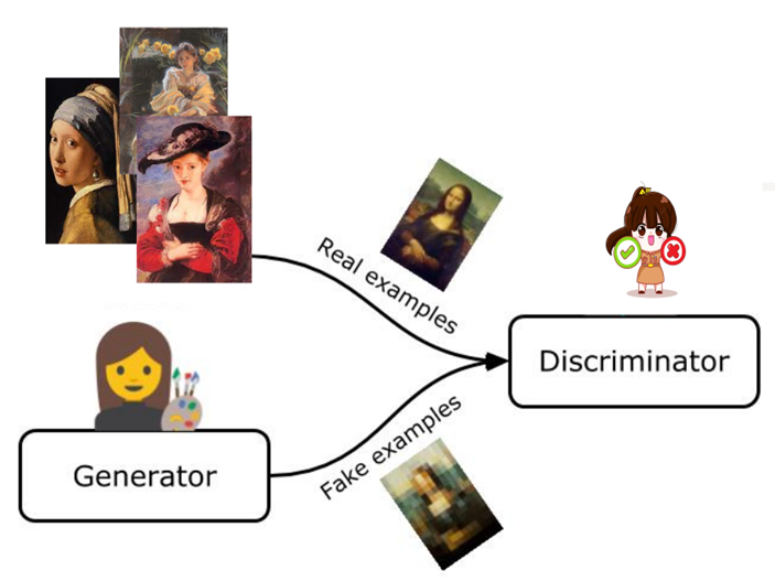 我们还是先举个例子来铺垫一下。假设有那么一对师生,老师和学生水平都一般,但是学生有一个很强烈的梦想:要成为达芬奇那样的大画家。于是,这个勤奋的学生每天不停地画,画完就交给他的老师给予指导。老师呢本身水平也不高,只能找些世界名画对比,看学生画的是不是像,越像的话给出的分数越高。学生拿到这个评价后继续努力,希望从老师那里拿到更高的分数。老师为了能分辨出学生的画与世界名画之间的差距,也不得不一点点改进,努力给学生的画挑刺找茬。这样,学生的做画水平越来越高,老师的找茬能力也越来越强,最后学生成为了绘画大师,所画的画和世界名画一般无二;老师则成为了鉴赏大师,一双慧眼总是明查秋毫。