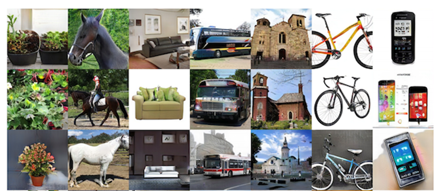 有了这个连最好的老师D也挑不出什么毛病的学生G,那么就可以用G来生成图片了。图3是用真实人脸图片训练出的GAN所生成的“假”人脸图片。可以看到,这些“假”人脸图片在肉眼看起来都非常接近真实。图4是用GAN生成的一些风景和物体图片,这些图片也都非常真实。