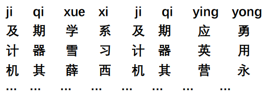 早期的拼音输入法是逐字输入的,即用户输入拼音,计算机提示该拼音对应的汉字,用户再从中进行选择。由于汉语中一个拼音可能对应大量汉字,人们不得不在一个长长的列表中进行选择,非常繁琐。后来,人们开发出基于整句输入法,用户一次性输入整句话的拼音串,机器即可将自动将其转换为正确的汉字串,几乎不用人为选择。例如,输入以下拼音串: