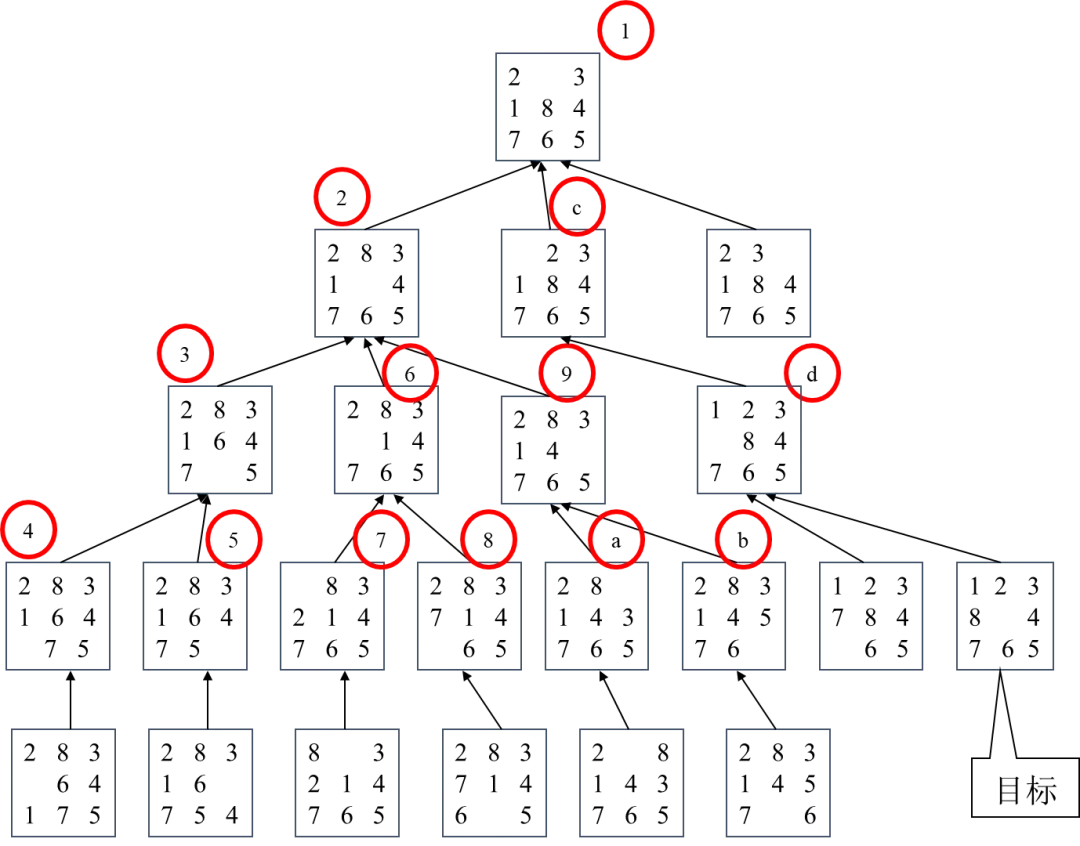 小明见艾博士留了练习题,马上认真做了起来,不一会功夫就给出了如图3.30所示的该问题的搜索图。图中用带红圈的数字和英文字母表示节点的扩展次序(1~9以后用a、b、c…表示),每次达到深度限制条件时进行回溯。通过搜索图可以得到该八数码问题的解为:将牌2右移、将牌1上移、将牌8左移。